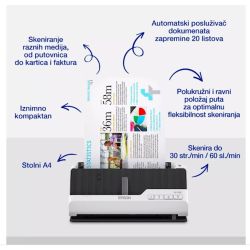 Polukružni položaj puta ovog skenera omogucuje skeniranje papira bez dodatnog zauzimanja prostora. Prebacite se na ravni položaj puta kako biste skenirali pasoš i brošure debljine do 5 mm. Tehnologija zaštite papira osigurava da izvorni dokumenti ostanu netaknuti. S niskom potrošnjom struje, garantuje manji utjecaj na okoliš. DS-C330 je iznimno svestran, pa skenira omotnice, PL kartice, ako i dugi papir i A3 ppair(uvezani). S potrošnjom struje od samo 3,3 w u nacinu pripravnosti i 1,0 w u nacinu mirovanja, uštedite energiju.
