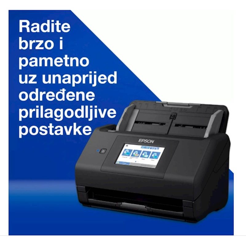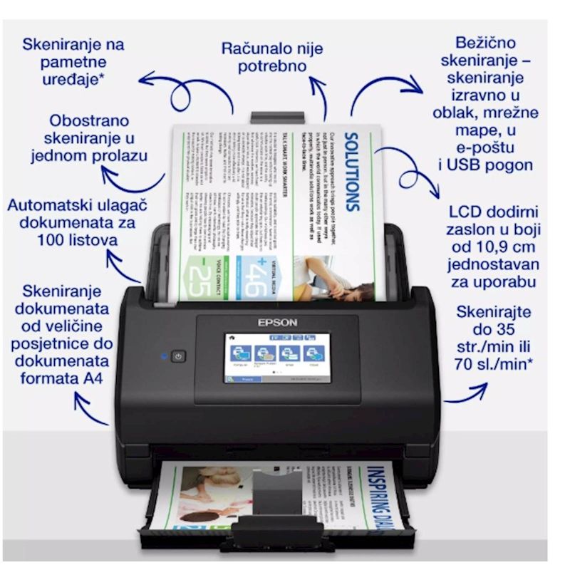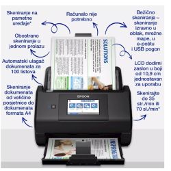 Neka vaše preduzece bude i dalje organizirano uz ovaj brzi skener s automatskim obostranim skeniranjem i automatskim ulaganjem papira formata A4. Pomocu velikog zaslona od 10,9 cm i Wi-Fi tehnologije možete spremiti dokumente izravno na njihovo mjesto. Radite brzo i pametno uz prilagodene postavke.