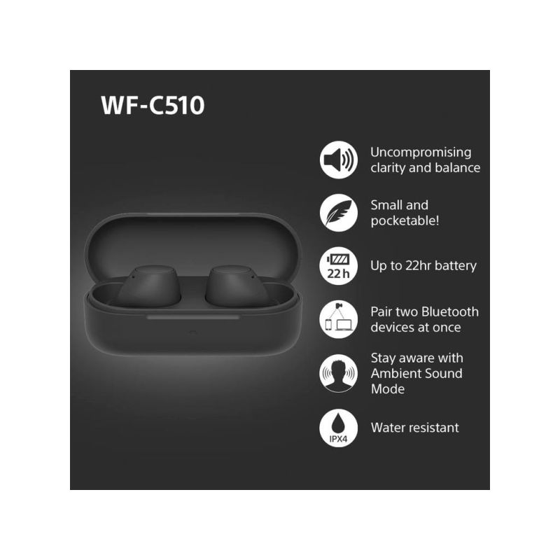 Sony bežične slušalice WF-C510; kompaktne i lagane za cjelodnevnu udobnost; 11 sati trajanja baterije, s još 11 sati u kutijici za punjenje; mikrofon; quick Access; istovremeno uparivanje s dva Bluetooth uređaja; pračenje zvuka okoline; boja crna