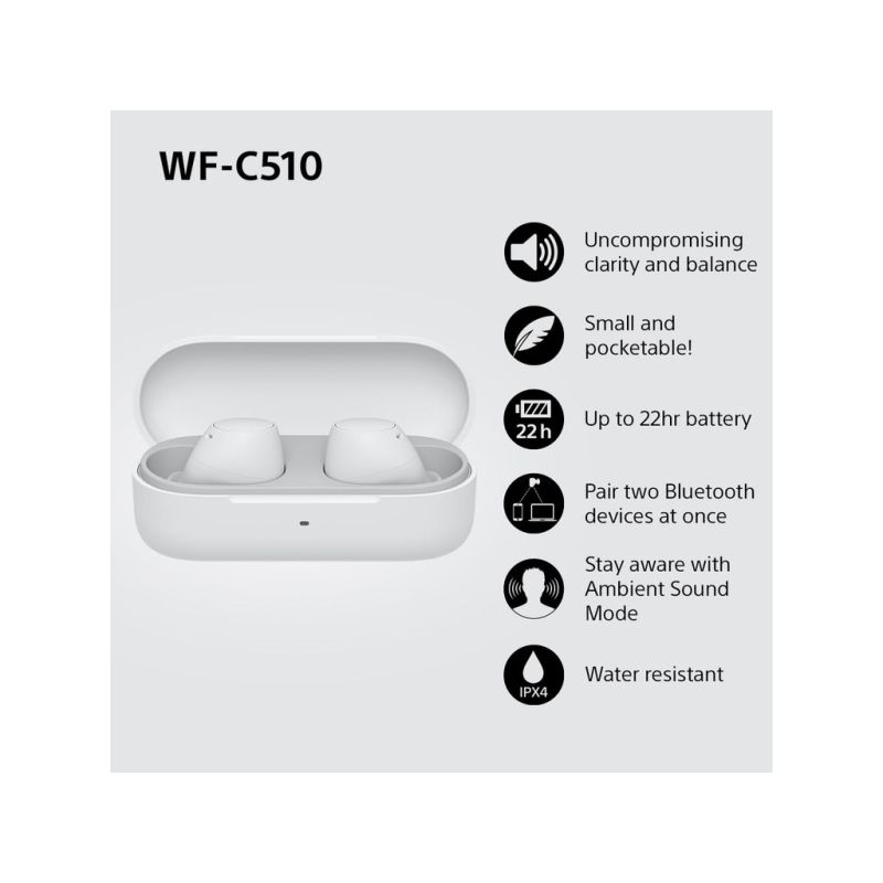 Sony bežične slušalice WF-C510; kompaktne i lagane za cjelodnevnu udobnost; 11 sati trajanja baterije, s još 11 sati u kutijici za punjenje; mikrofon; quick Access; istovremeno uparivanje s dva Bluetooth uređaja; pračenje zvuka okoline; boja bijela