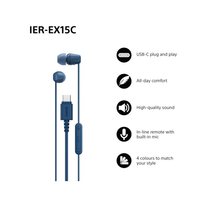 Sony In ear žične slušalice, USB-C, Androis/iOS kompatibilne, 5mm drajveri za snažan bas, mikrofon višesmjerni, daljinska kontrola, glasovni asistent, kabl 1.2m, XS/M/XL silikonski umetci, boja plava