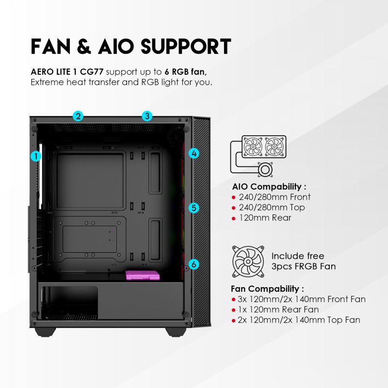 Ventilatori: 3x 120mm/ 2x 140mm (naprijed); 1x 120mm (nazad); 2x 120mm/ 2x 140mm (vrh)