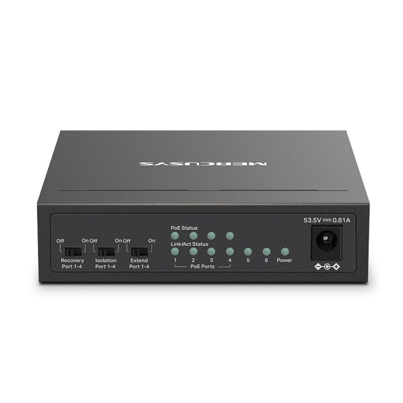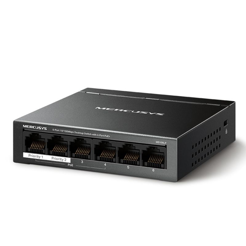 Mercusys MS106LP 6-portni 10/100 Mbps Desktop prekidač sa 4-porta PoE+, kompatibilan sa 802.3af/at PD-ovima, 40 W PoE napajanje, stolno čelično kućište, montiranje na zid, prošireni način rada za 250m PoE prijenos, prioritetni port 1-2 Mode, PoE Auto Recovery
