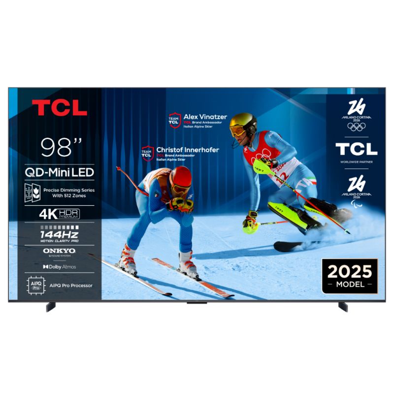 TCL 98"C6K 4K QD-Mini LED TV; 144Hz native display; Matte HVA Panel; Google TV; Game Master; Dolby Atmos; Onkyo 2.1; HDR Premium; HDR10+ HDR10 HLG; Netflix Youtube Amazon Prime Apple TV; Chromecast & T-cast; HDMI: 4x 2.1; USB: 1x 3.0;