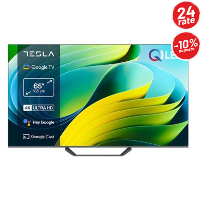Tesla Q65E655GUS 65" QLED 4K Google TV donosi vrhunski kvalitet slike, impresivne boje i moderan dizajn za potpuno kino-iskustvo u vašem domu. Zahvaljujući QLED tehnologiji i 4K Ultra HD rezoluciji, prikaz je izuzetno oštar, sa bogatim kontrastom i živim bojama. HDR10+ podrška dodatno poboljšava detalje u tamnim i svijetlim scenama, pružajući realističan prikaz svakog sadržaja.