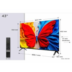 TCL 43"S5K FHD QLED TV;60 Hz HDR 10 Android TV; Dolby Digital Plus; HDR10: Netflix USB 1080p; Android TV (ATV 11.0) Google Play Store; Chromecast & T-cast; HDMI 2x 1.4 USB 1x 2.0; Multiple Viewing Mode; Metallic Bezel-less; Brushed metal front