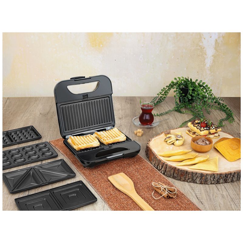 Toster 800 W, 5u1, veličina ploče 21.6 x 12 cm, ploče od nehrđajućeg čelika, 5 različitih ploča, sustav zaključavanja, indikator rada, automatska kontrola temperature, neljepljiva uklonjiva ploča jednostavna za čišćenje, uspravno odlaganje uz uštedu prostora
