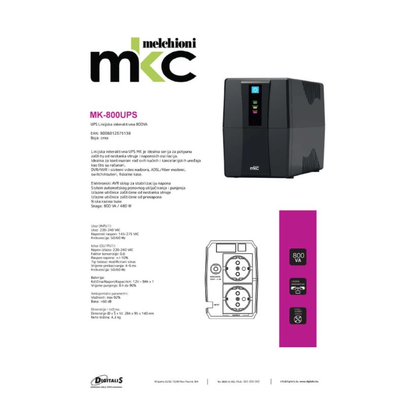 MKC UPS/ Izvor neprekidnog napajanja, 800VA, 480W - MK-800UPS