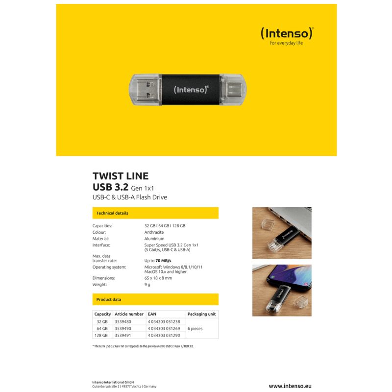 (Intenso) USB Flash drive 128GB, USB 3.2, USB-C, USB-A, Twist Line - USB3.2-128GB/Twist Line