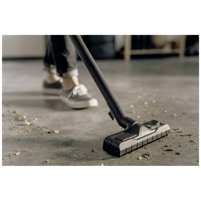 Uređaj dolazi s robusnom plastičnom posudom od 25 litara, kabelom od 5 metara, usisnim crijevom duljine 2,2 metra s uklonjivom, elektrostatički zaštićenom ručkom, podnom mlaznicom koja se može prebaciti, ravnim naboranim filterom i filtar vrećicom od flisa.