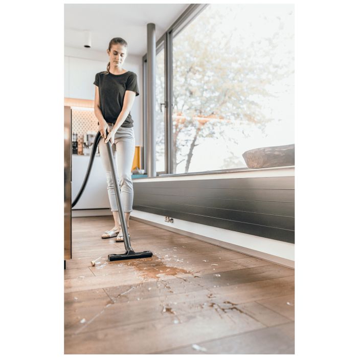Usisavač za mokro i suho usisavanje ima robusnu plastičnu posudu od 12 litara, kabel od 4 metra, kao i usisnu cijev dugu 1,8 metara s ravnom ručkom, podnu mlaznicu Clips, pjenasti filter i filter vrećicu od flisa.