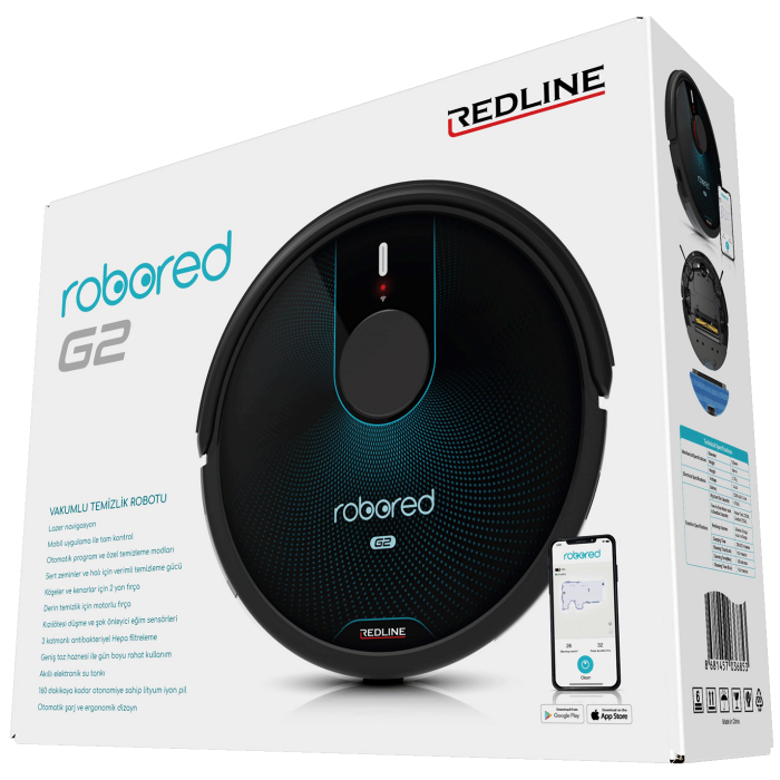 - Čak i ako može raditi sam, možete pratiti svog robota na svom mobilnom telefonu. Aplikaciju “Robored” koju možete preuzeti s play store-a za Android i appstore-a za IOS možete koristiti za upravljanje svojim uređajem, postavljanje programa čišćenja, pamćenje razdoblja održavanja i čišćenja te praćenje radnog vremena. Možete ga postaviti da čisti cijelo područje koje je robored mapirao putem aplikacije ili možete odabrati određene regije i prostorije za djelomično čišćenje. Naprotiv, možete označiti područja koja ne želite raditi kao zabranjena područja i spriječiti ih da rade u tim područjima. Možete programirati da se sve ove operacije čišćenja i brisanja izvode na datume i vremena koje želite. U tu svrhu možete izraditi periodični program čišćenja na svom mobilnom telefonu ili možete zadovoljiti iznenadnu potrebu za čišćenjem kada ste odsutni. Kada je Redline Robored G2 Robot Vacuum potpuno napunjen, može neprekidno raditi do 160 minuta sa svojom baterijom od 5200 mAh. Ovo vrijeme sasvim je dovoljno za čišćenje velike površine, a ako se uzme u obzir da ne pokušava zabušavati niti na minutu, očito je da ima učinak neusporediv s ljudskom studijom. Štoviše, sa svojom značajkom pametnog punjenja, može se vratiti na stanicu za punjenje kako bi dovršio punjenje i nastavio s radom tamo gdje je stao.