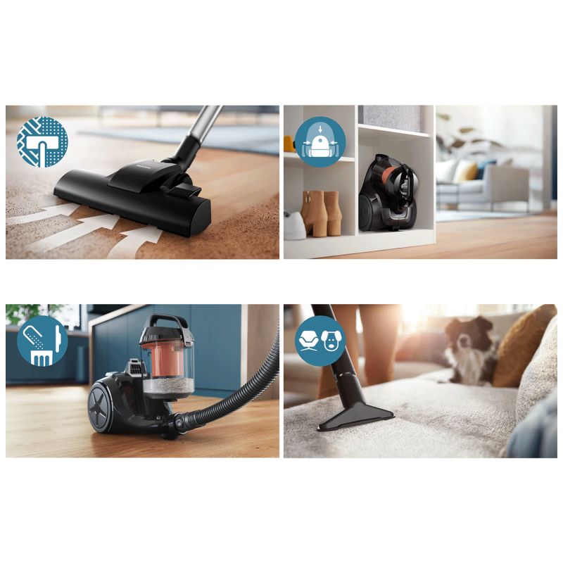Philips VC 1000 Series je kompaktan i lagan usisivač bez vrećice, idealan za svakodnevno čišćenje doma. Zahvaljujući tehnologiji PowerCyclone 3 i snažnom 800 W motoru pruža dobru usisnu snagu za različite vrste podova. Posuda za prašinu se lako prazni, a cijeli uređaj je praktičan za korištenje i odlaganje. Višenamjenski nastavci omogućavaju detaljnije čišćenje namještaja, uskih prostora i većih površina, dok kvalitetni filteri pomažu da zrak koji izlazi iz usisivača bude čišći.