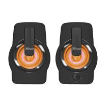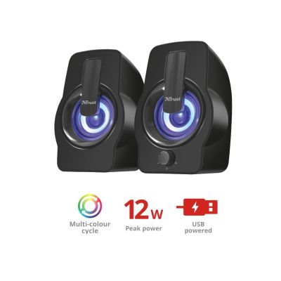 Trust Gemi RGB 2.0 set zvučnika, crni. Kompaktni set zvučnika sa elegantnim dizajnom i RGB LED osvjetljenjem, 12 W, 3.5 mm audio input, dužina napojnog i audio kabla 1,4 m.